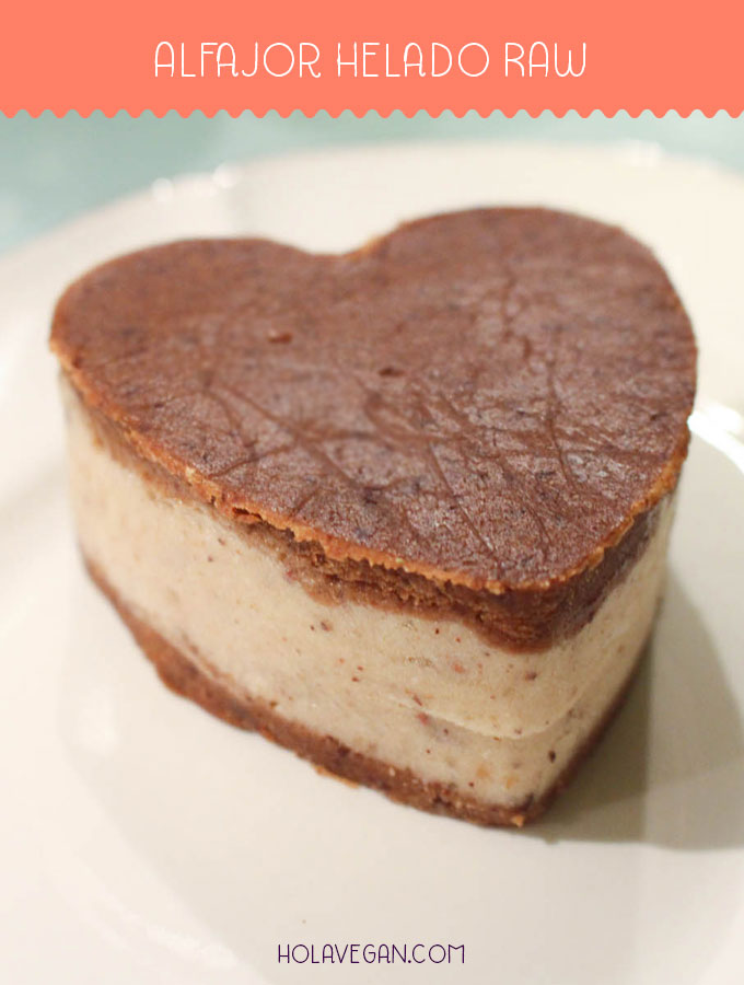 Me contaron que en Buenos Aires está haciendo mucho calor, así que se me ocurrió dedicarles este post a todos los habitantes del suelo argentino que están pasando un veranito pesadito. Un alfajor helado saludable, sin azúcar, bajo en grasa, sin glúten, vegan y raw? SI! Un alfajor helado fácil de hacer, con ingredientes naturales, fáciles de conseguir y baratos? SI! Un alfajor helado delicioso? SI! HOLA! Para las “tapas” usé mi clásica ya, base de postres raw (harina de almendras, harina de coco y dátiles) No conseguís las “harinas”? Agarrás coco rallado y almendras y los pasás por la procesadora, la licuadora o la minipymer hasta hacerlos polvo. Los dátiles están en casi todas las dietéticas, pero si no conseguís, podés usar ciruelas pasas, pasas de uva o cualquier otra fruta disecada. Las almendras están caras? Usá cualquier otra fruta seca que esté más barata, cajús o maní. También podés reemplazar por avena (si no tenés problema en consumir glúten) Para el helado, usé el mágico y maravilloso helado de banana aka “nice cream”. Bananas congeladas, procesadas y hechas helado. Yo lo hice bien simple, pero pueden tunearlo tanto como quieran, por ejemplo, hacerle una rica cobertura de chocolate y rebozarlo con coco rallado o praliné de almendras. Pueden hacer el helado con un poco de dulce de leche vegan o hacerlo un poco más lujurioso y mezclar con las bananas frambuesas/frutillas congeladas. Pueden hacerlo en forma de corazón como postre de San Valentín. Pueden rebozar con pistachos, agregar mango al helado, también un poco de vino moscato y hacerlo tipo “sabayón”. Yo les tiro algunas ideas pero las posibilidades son infinitas. A jugar con la imaginación!