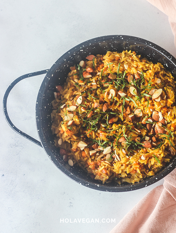 Es un plato con arroz, verduritas y (en su versión tradicional), carne, pollo o a veces pescado, condimentado con especias.