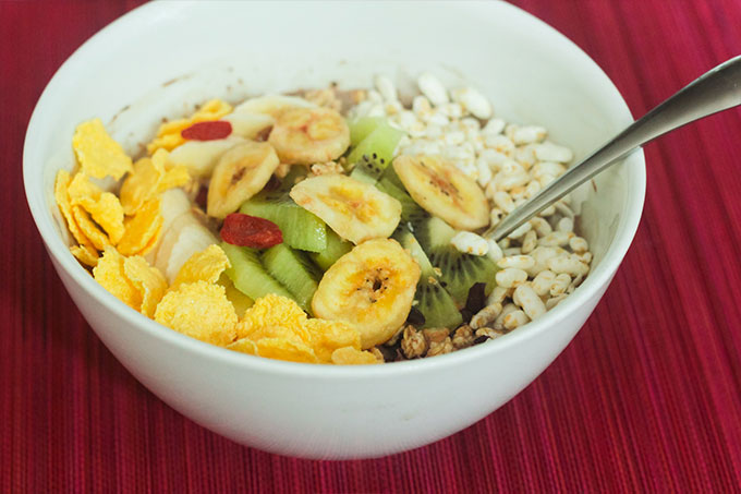 Un desayuno nutritivo y llenador, muy fácil y rápido de preparar. Lo único que hay que hacer por adelantado es dejar la avena hidratando la noche anterior, así por la mañana, solo queda cortar la fruta y agregarle los cereales. Nada más simple, verdad?