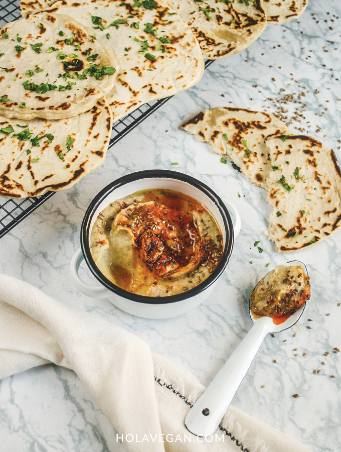 Podés untarlo sobre pan fresco o tostado, con estas crocantísimas talitas, con el pan naan como lo hicimos nostras en la foto, o, como lo hacen en su país de origen, sobre pan pita.