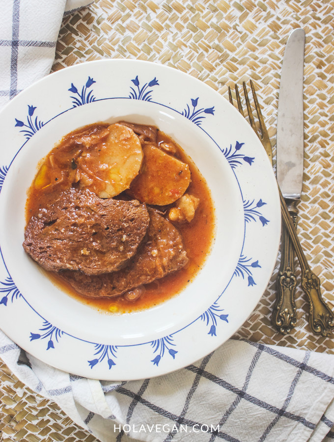 Cuando éramos niñas, mamá preparaba este plato, claro que con tajadas de animalito. Para reemplazar a la carne vacuna, qué mejor que el seitán? Sobre todo, si hacés nuestra espectacular versión que queda tierna y jugosa. Es una comida muy sencilla, seitán, papas, cebolla y pimiento rojo, un poco de tomate, que puede ser natural o puré y condimentos.