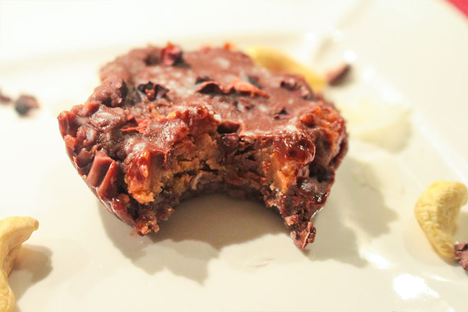 - Mix the melted coconut oil with cacao and syrup until a sauce, set aside.