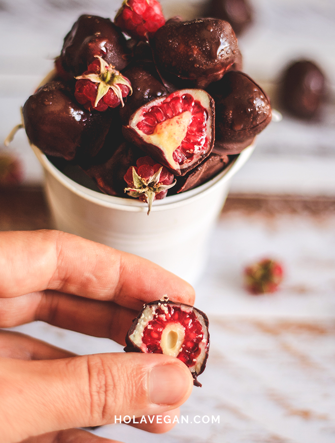Lolét siempre dice que “la fruta no es postre”, que para que sea postre HAY QUE PONERLE ONDA, tal como explicó en esta entrada de esta cassata. Claro que en el blog tenemos muchos posteos de frutas convertidas en postres, como estas bananitas tipo Dolca o este palito helado de banana, la tarta de peras, los dátiles rellenos que son una locura de ricos o estas chocofrutillas. Esta receta no es la excepción, porque se trata de unas frambuesas con un baño de chocolate blanco primero y negro después, que las convierten en unos riquísimos bombones.