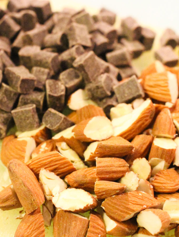 - Add the chocolate chunks and almonds, if using, mix.