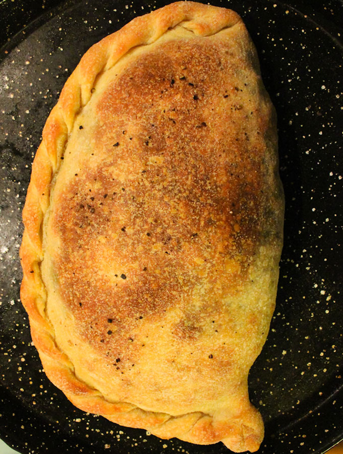 Se trata simplemente de hacer una empanada gigante con la masa de pizza y rellenarlo con cosas ricas.