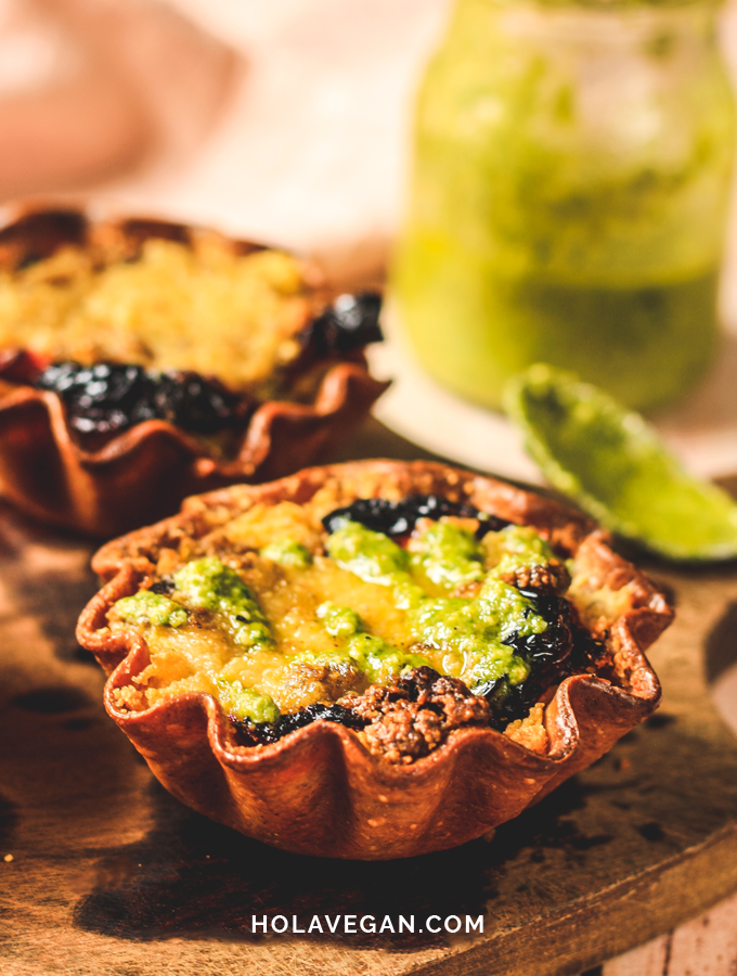 - Mezclar la ricota con levadura nutricional y condimentar con sal, pimienta y oliva.Volcar la ricota dentro de las canastitas.