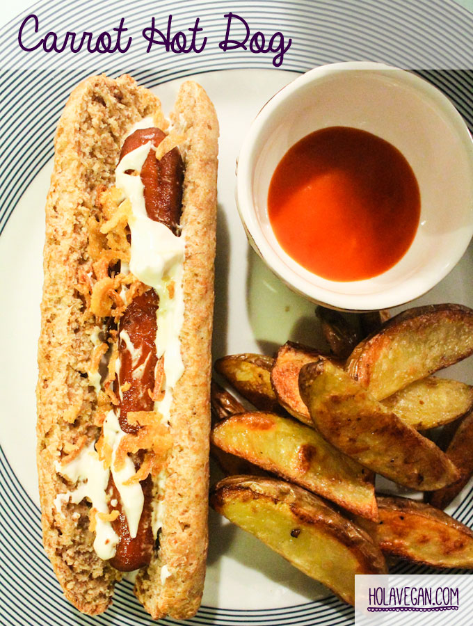 No se imaginan la cara de asco de mi marido, cuando el otro día llegó del trabajo y le dije: Vamos a comer panchos! Cabe aclarar que a mi marido (no vegan) no le gustan las mock meats, ni el tofu, ni el seitán, ni el tempeh. Mucho menos las salchichas vegan compradas. Claro, le da más asco una salchicha hecha a base de plantas que una salchicha hecha a base de orejas, ojos, órganos, pezuñas y ano de chancho, pero bueno, así es la realidad, bastante absurda, no? De todas formas, ahí mismo le expliqué que no le iba a dar nada raro, sino que había preparado unas salchichas-zanahoria. Se las mostré, las miró intrigado pero con cara de curiosidad buena y se predispuso muy bien, como siempre.