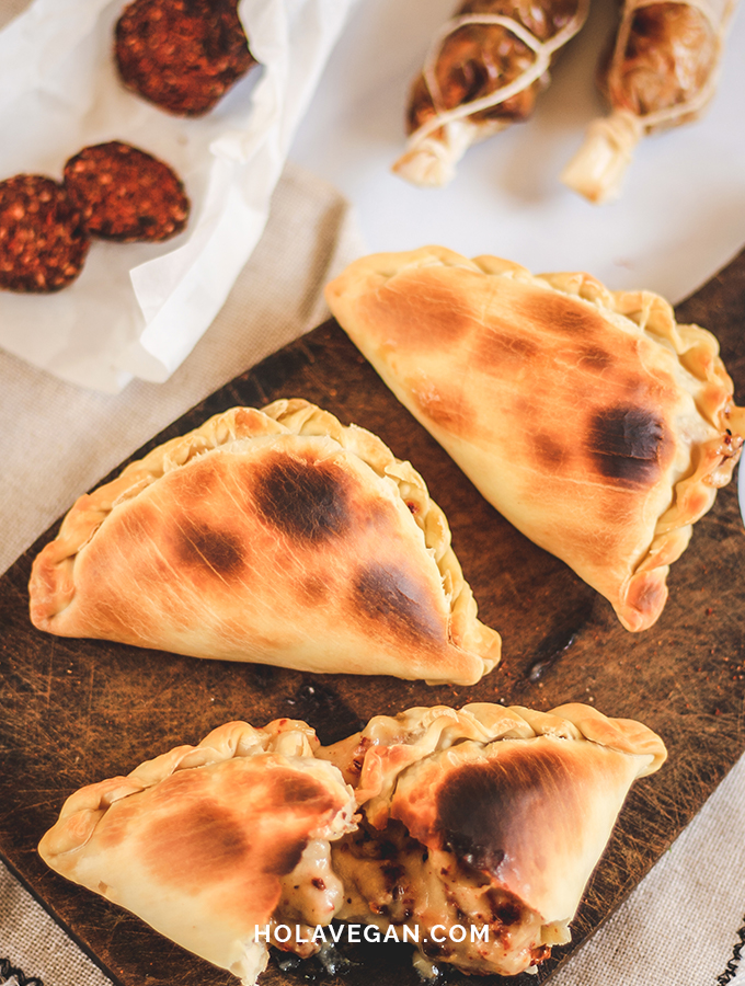 Ojo, hay quienes le suman un sofrito de cebolla y ají y hasta le añaden aceitunas verdes. Pero la mayoría de seres non vegan con experiencia en este sabor de empanada que consulté, me dijeron que eso era una especie de sacrilegio y que con la longaniza y una buena muzza era más que suficiente. Entre nos, aunque nunca en mi vida no vegana probé una calabresa, a juzgar por el resultado obtenido, tenían razón.