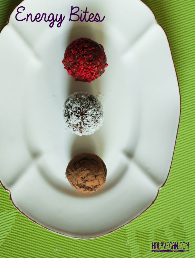 OOOOOOOH qué deliciosas e irresistibles estas bolitas energéticas, llenas de nutrientes y sabor! Estas Energy Bites son: Crudas (RAW) veganas, sin gluten y sin azúcar! La base es de almendras activadas, dátiles, cacao nibs y vainilla y usé 3 rebozados diferentes, cacao raw, coco rallado y frambuesas disecadas trituradas: Amargo, dulce y ácido. Un juego para los sentidos. También podés rebozarlas con semillas, con azúcar de coco, con pistachos triturados, avellanas, copos de cereal (ya no serían raw) en fin, lo que se te ocurra que puede llegar a quedar rico, a usar la imaginación! Es importante activar las frutas secas para que podamos digerirlas correctamente y asimilar todos sus nutrientes, para ello, simplemente hay que dejarlas en remojo con agua filtrada, si es posible toda la noche, pero si no, con un par de horas es suficiente. Luego se escurren y se utilizan. Estas bolitas son muy fáciles de preparar, se procesan todos los ingredientes hasta formar una masa y se deja enfriar bien, luego se arman las bolitas y rebozan con lo que más te guste. Se conservan en la heladera por 1 semana (aunque no creo que te duren tanto!)