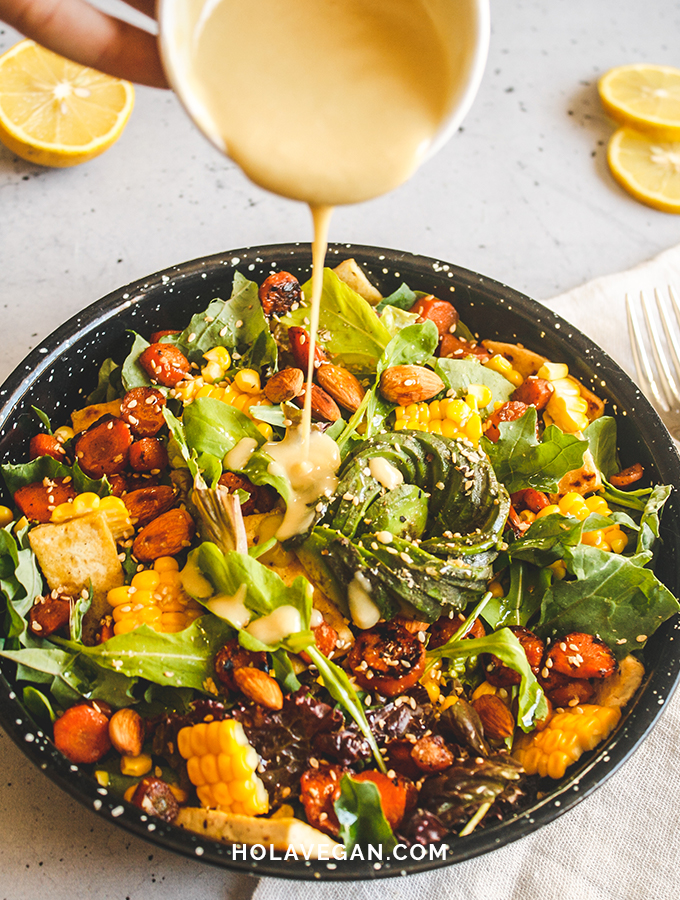 Originalmente tenía hojas verdes, choclo real -no de lata-, zanahorias caramelizadas, almendras tostadas, palta y atún. El atún, desde que soy vegana, lo reemplazo por hongos o tofu grillado -como en este caso-, pero el resto lo mantengo igual, porque es una combinación muy deliciosa, solo le agrego alguna que otra cosita, como las semillas.