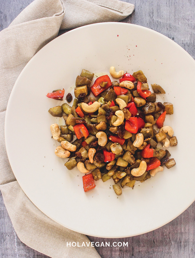 - Mezclar las berenjenas con el pimiento, rectificar de sal, agregar las pasas de uva.