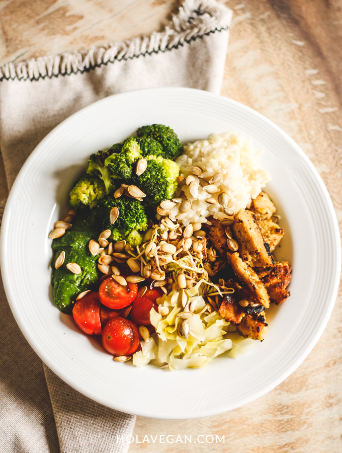 - ALGO CAPRICHOSO. Yo le digo “el gustito”, algo que te guste mucho comer. Es decir, que nutra más el alma que el cuerpo en sí. El mío fue este no-pollo, salteado con muuucho limón hasta quedar crocantito. Algunas ideas: scrambled tofu, hongos salteados, albondiguitas, este queso de lupines, falafel, tomates confitados, unas croquetas.