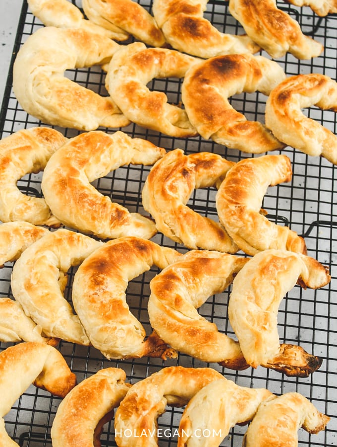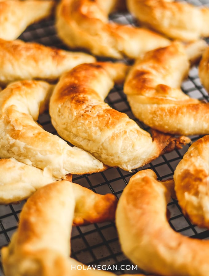 - Estirar las puntas y colocar en una placa aceitada dando forma de medialunas. Presionar las puntas sobre la placa y montar sobre las puntas la siguiente medialuna.