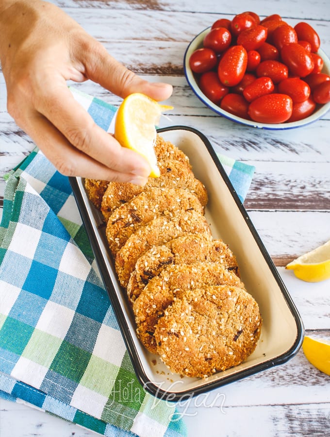 Usé avena y rebozador sin gluten, pero ustedes pueden hacerlas con avena y rebozador tradicionales, o con panko.