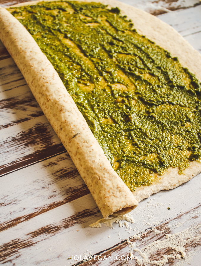 Les cuento que la masa es súper fácil. Sólo lleva harina, levadura, sal y agua. Nada más. No lleva aceite porque la grasa se la sumamos directamente con el pesto. La receta de dicha salsa la encuentran haciendo click acá.