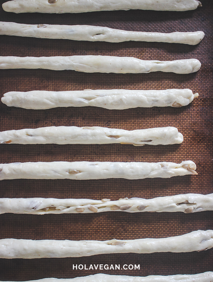 - Hacer "gusanitos" con las porciones de masa y acomodarlos en una placa para horno, levemente aceitada o con una placa antiadherente