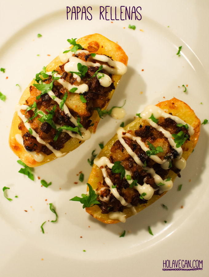 Hoy les traigo una receta de “La Veganista” creo que ya les he hablado de ella, una muchacha que vive en Berlín, nieta de carnicero (HELLO?) que además de un blog ha escrito un libro de recetas que está muy bueno. Aunque yo no soy de seguir recetas, sino más bien de CREAR recetas, en este caso, tomé su idea para las papas rellenas, obvio que cambié algunas cosas, pero no quiero dejar de reconocer mi inspiración. Este plato puede ser un acompañamiento o un plato principal, yo decidí que estas papas serían las protagonistas de mi plato, así que las acompañé con una fresca ensaladita de hojas verdes. Quedó realmente delicioso! Preparé una salsita muy simple, con un poco de vegan mayo, jugo de limón y aceite de oliva. MMMMMMMM