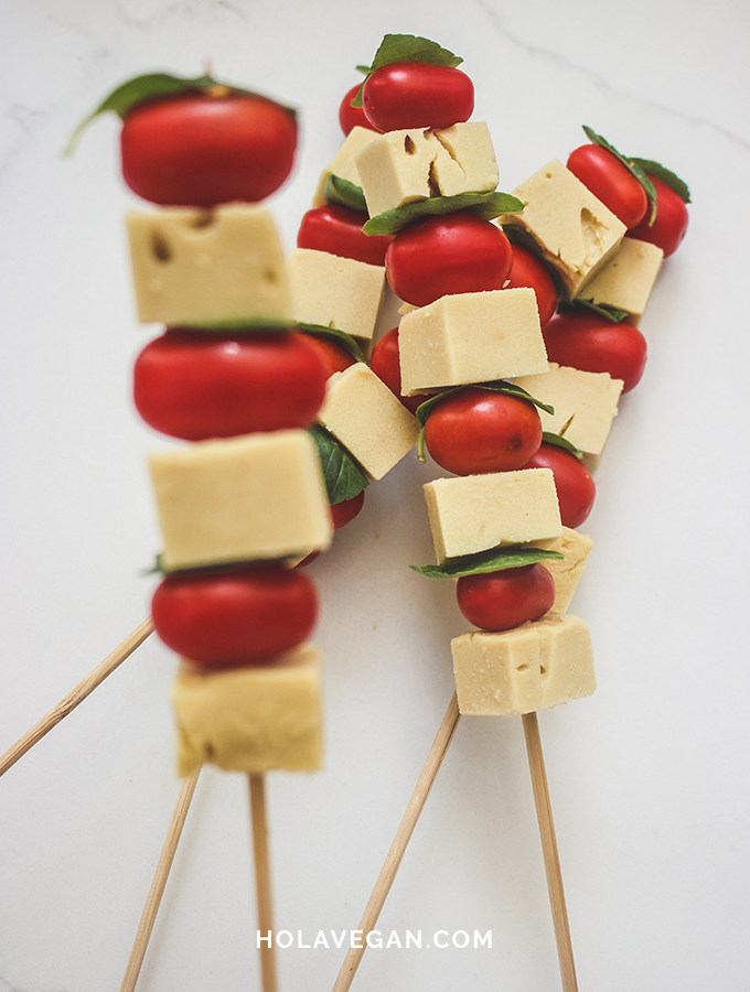 - En un pincho de madera o metal ir alternando un cubito de queso, un tomate cherry y una hoja de albahaca hasta completar el pincho.