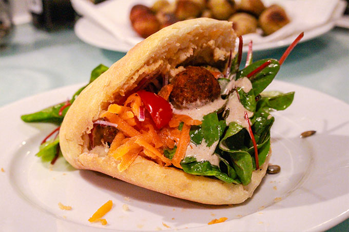 La manera más clásica de comer el falafel es en un wrap o en este tipo de pan, que es un pan achatado y hueco en el medio, se rellena con las croquetas y las verduras frescas que más te gusten, yo usé tomates cherry, cebolla morada, zanahoria rallada y hojas verdes, además de hummus y una salsa de tahine.
