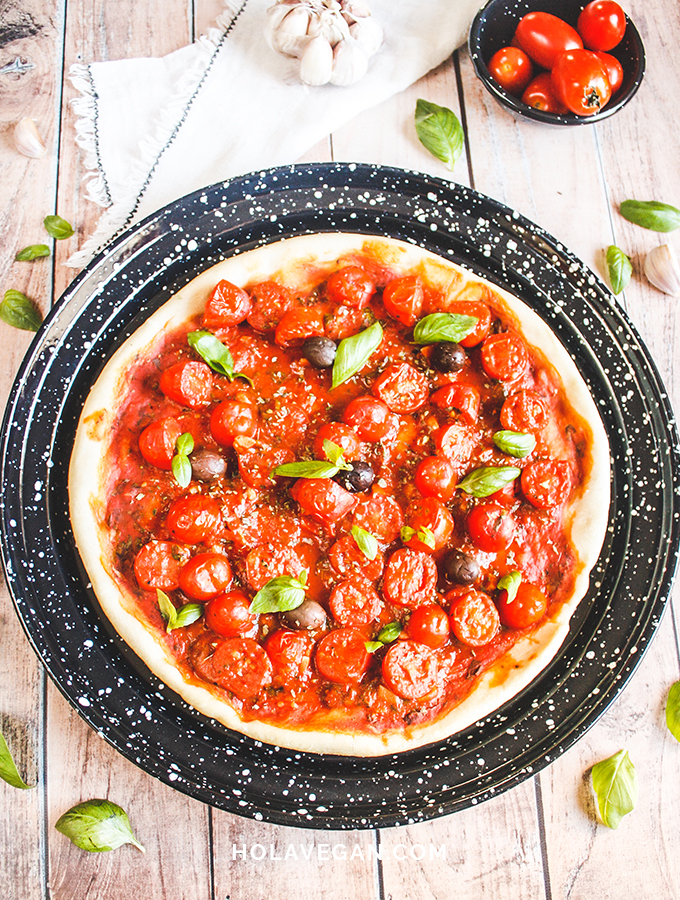 Para esta versión, usé la misma masa que les enseñamos en la fugazzeta rellena. Con esa proporción salen dos pizzas chicas o una muuuuy grande. Y le puse onda, para que quede más canchera aún. Además de la salsa de tomate que originalmente en casa hacemos con albahaca y condimentos, le puse ajo picado y tomates cherry salteados. Es realmente tan sabrosa que no se extraña para nada la presencia de muzza.
