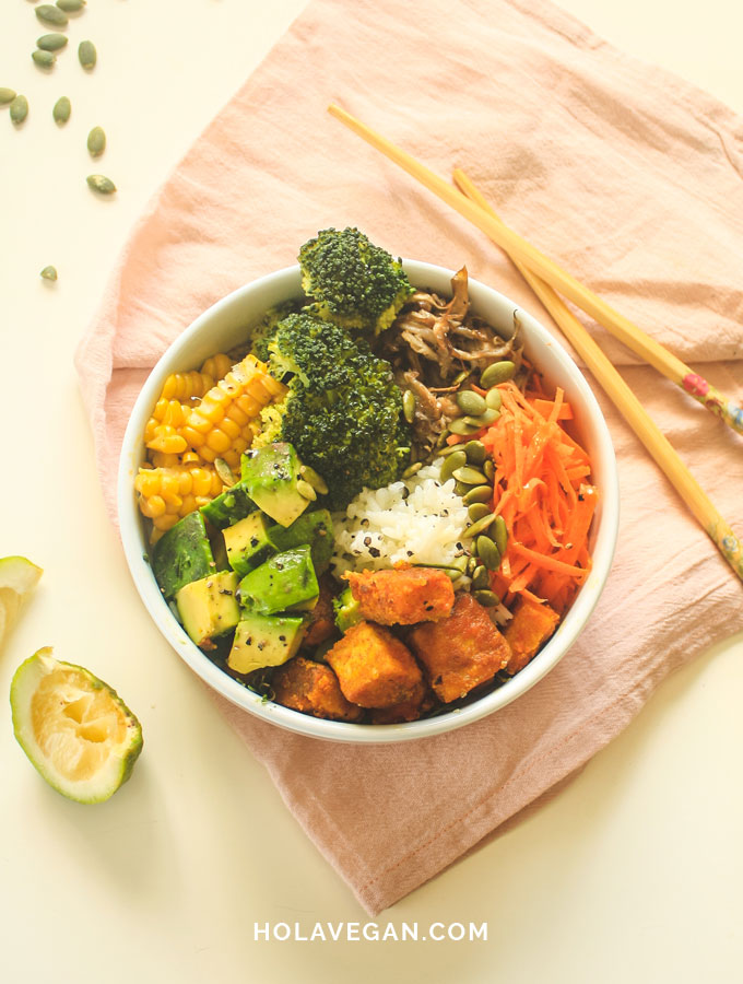 - Se puede personalizar a gusto y piacere, siempre y cuando se involucren: un cereal (arroz, quinoa, etc.), una proteína (tofu, tempeh, legumbres), vegetales (crudos y/o cocidos), un aderezo (puede ser algo elaborado como este dressing saludable o simplemente oliva y limón) y toppings (semillas, cebollita picada, etc.).