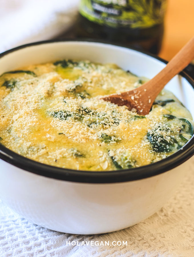 - En mitad de la cocción de la polenta, agregar el queso derretible vegano y la espinaca cocida.