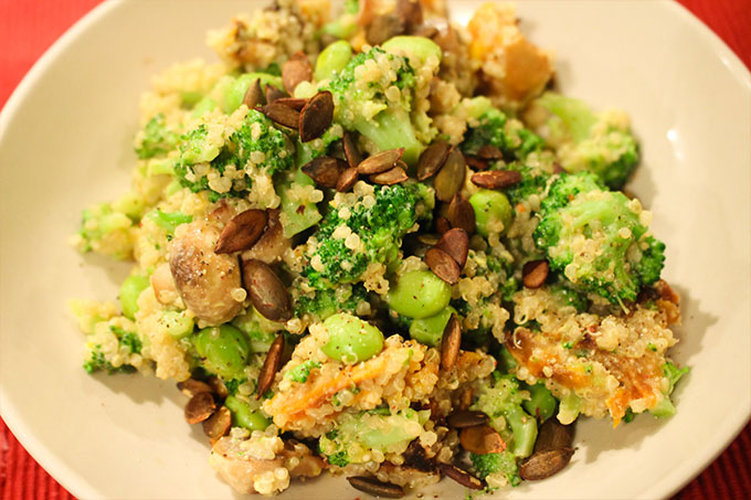 - Serve quinoa with vegetables, salt, pepper and pumpkin seeds.