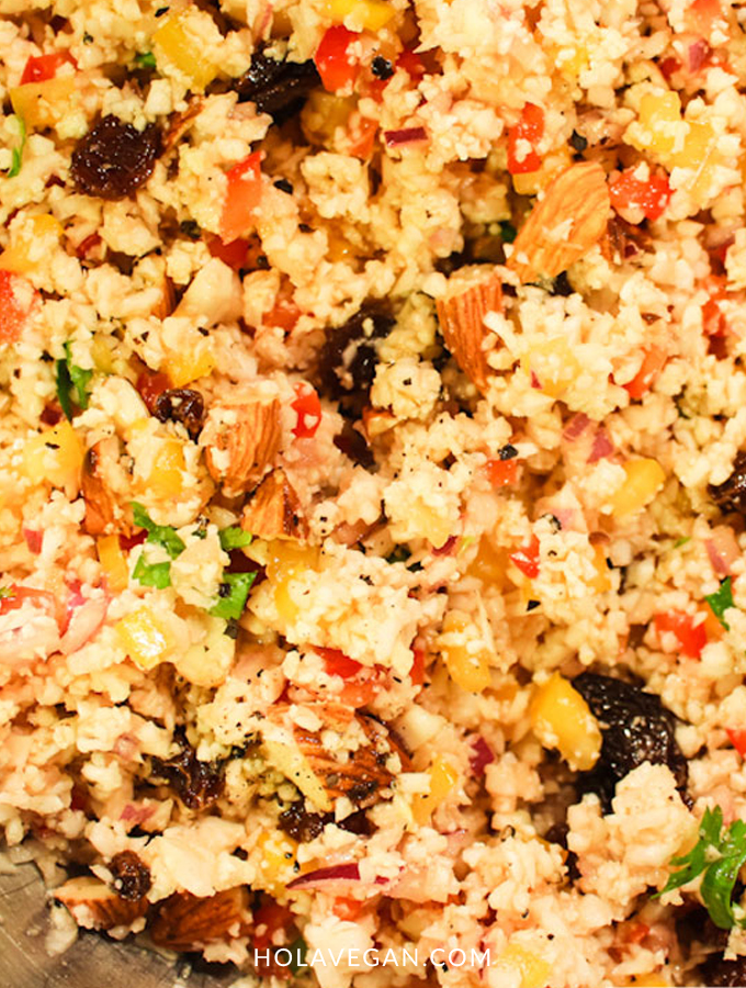 Cómo cómo cómo??? Tabbouleh crudo??? Peeeeeeeeeerooooooooo… y el cous cous??? Acá me tienen descubriendo las maravillas de la comida cruda, estoy como en Disneylandia! Yo no tenía idea de las cosas increíbles que se pueden hacer, y muchas son muy fáciles! Estoy entrando en mi segunda semana de comida 100% cruda y debo decirles que me siento como una locomotora! Es espectacular cómo los niveles de energía se van para arriba cuando comemos sólo alimentos crudos, alcalinos, enzimáticos, vivos, llenos de nutrientes! Uno podría creer que comiendo sólo comida cruda se pasa hambre y no se tiene fuerza, pueeeeeeeeeeeeessssss TODO LO CONTRARIO! La comida cruda alimenta de manera más eficiente a nuestro organismo que la comida cocida, es por eso que, el sistema digestivo tiene menos trabajo que hacer, gasta menos energías en digerir, gracias a las enzimas presentes en los alimentos crudos. Bueno, basta de palabreríos! Sólo quiero animarlos a probar comer más comida cruda, que puede ser muy divertida y deliciosa, además de saludable! Volviendo al Tabbouleh, como bien lo estarás suponiendo, no usé trigo burgol, ya que, no sería crudo de haberlo hecho. Eso que parece trigo burgol y que tiene su misma textura en mi ensalada, es… TATAN TATAAAAAAAAAN COLIFLOR! Si si, lo corté groseramente y lo pasé por la procesadora, hasta lograr estos minúsculos pedacitos similares al bulghur. Luego, solo resta agregarle los ingredientes típicos de un Tabbouleh, pimientos picaditos, cebolla morada, cilantro (o menta) pasas de uva, almendras. Yo hice una vinagreta de lima, aceite de oliva y sirope de dátiles, para darle un toque dulzón! Acá va la receta!