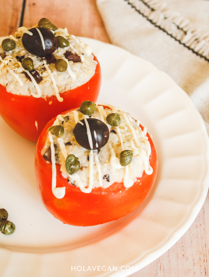 Nunca fui muy fanática de los tomates rellenos, pero a nuestra mamá le gustaban taaaaaaaaaaanto, que ahora los como para rendirle homenaje. Y como tenemos el no-atún que les compartimos en esta receta, hacerlos tiene más sentido, porque el sabor sigue intacto!
