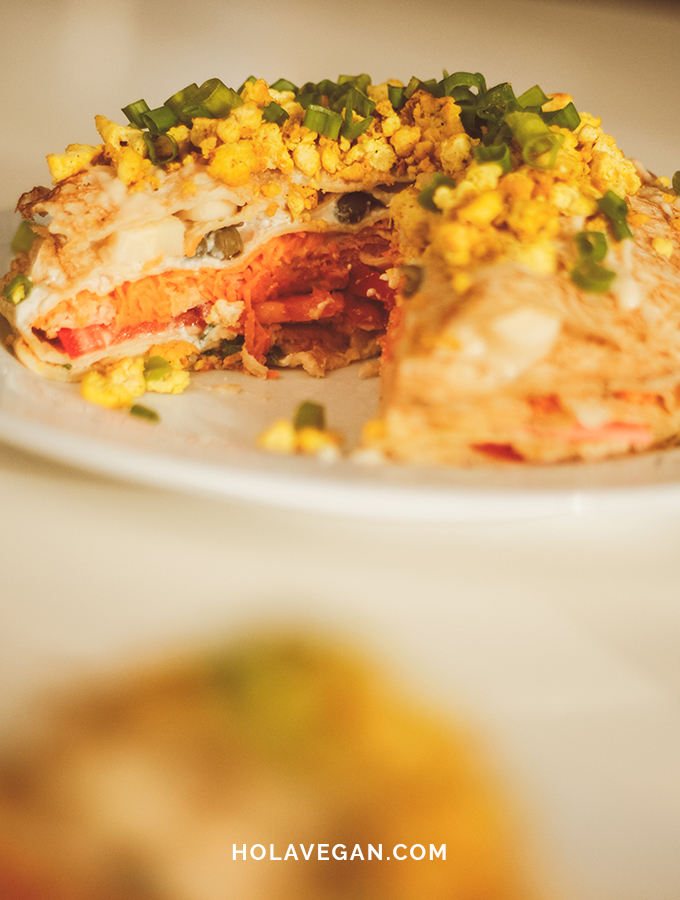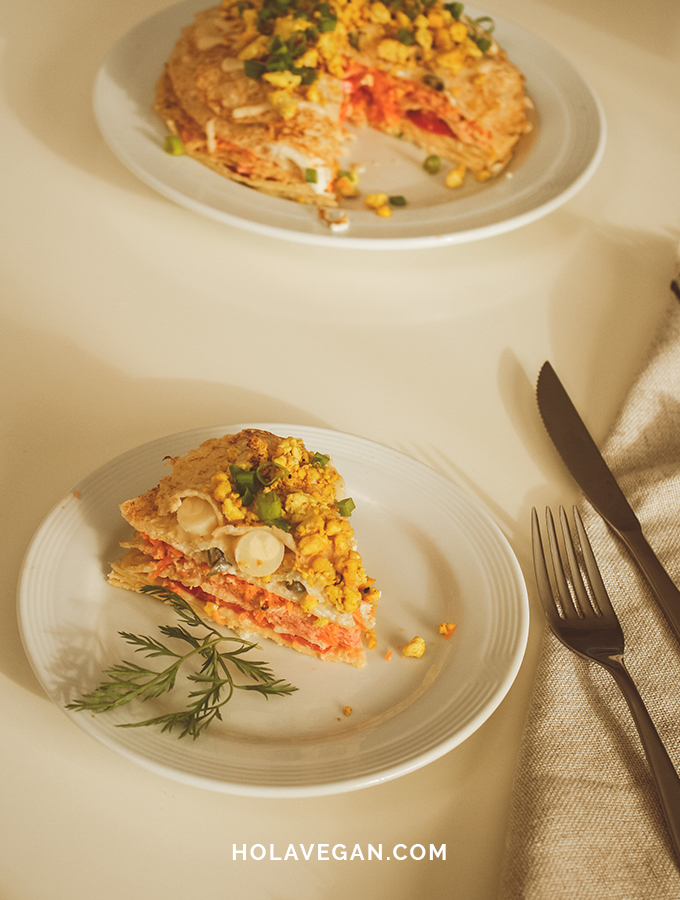 - Colocar la última capa de panqueques, condimentar con mayonesa y agregar el scrambled tofu y cebolla de verdeo picada por encima.