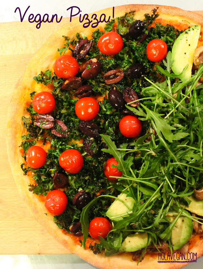 Quién dijo que la pizza sin queso no es pizza? La pizza sin queso es maravillosa, llena de vida y color, verduras crudas y cocidas, jugosas, cremosas, crocantes, sabrosas. Siempre se le puede poner un queso vegano, pero hay veces, en las que la prefiero así, natural y exquisita. En este caso, la hice mitad y mitad, para poder disfrutar de dos sabores a la vez! una mitad tiene kale, aceitunas negras y tomates cherry, la otra mitad tiene hongos salteados, rúcula fresca y palta. AAAAAAAAH un placer!