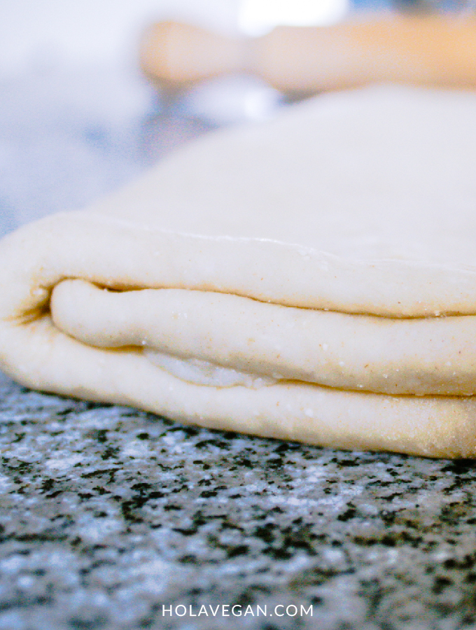 - Estirar nuevamente con palo de amasar y volver a doblar y a estirar dos veces más.