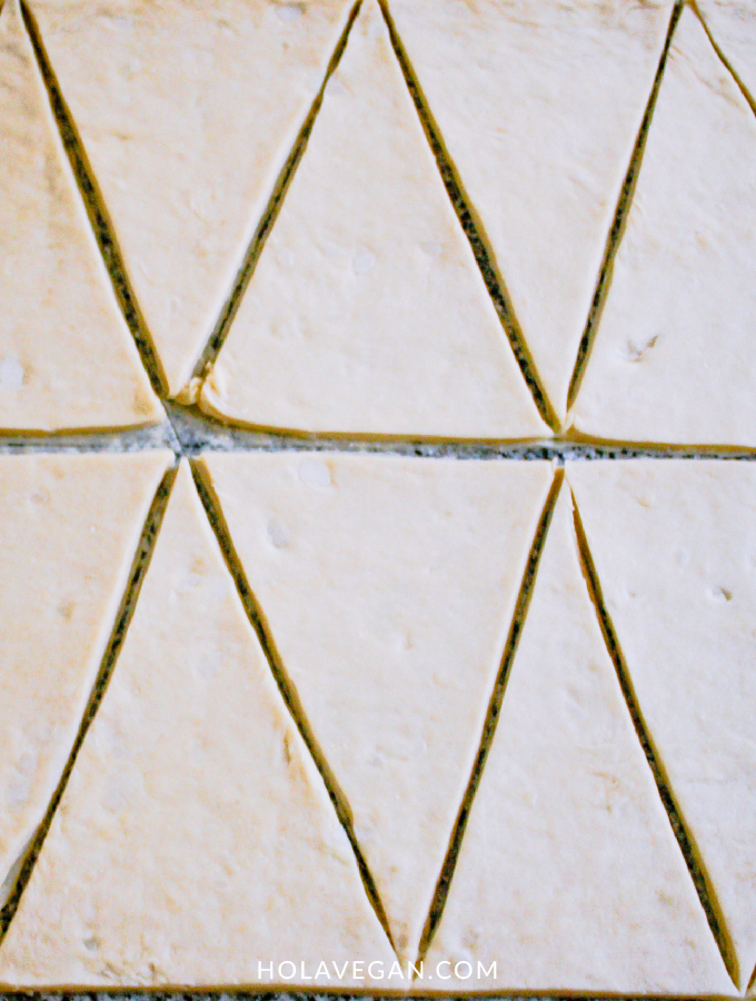 - Estirar la masa bien fina (2 o 3 milímetros). Recortar los bordes y cortar en triángulos isósceles (de dos lados iguales) como en la foto. Con lo que sobra de los bordes, se puede volver a “hojaldrar” y hacer cuadraditos azucarados o más vigilantes, como gusten.