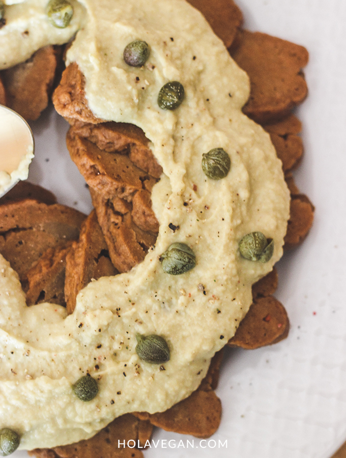 - Servir la crema sobre rodajas de seitán, moler pimienta y decorar con más alcaparras
