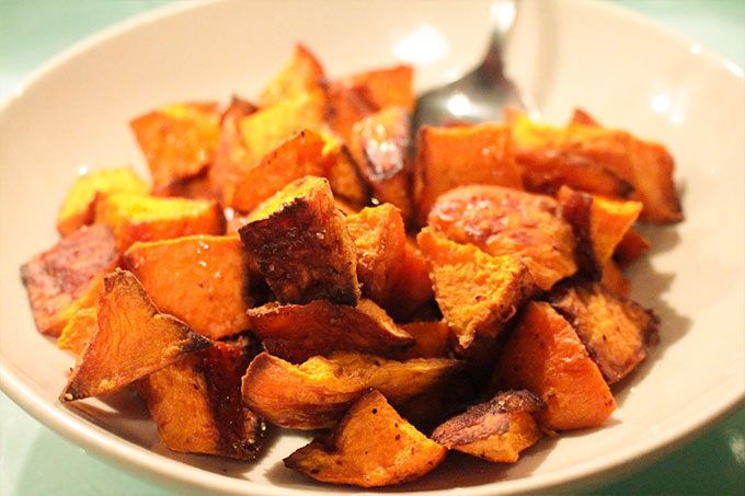 - Pelar la batata y cortar en pedazos chicos, tamaño bocado.