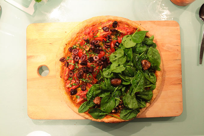 Yo hice esta vegan pizza de dos sabores, mitad con tomates cherry frescos, albahaca y aceitunas negras. La otra mitad con hongos salteados y espinacas frescas. Es como comerte una ensalada sobre una masa de pizza, súper liviana, crocante, sabrosa y saludable.