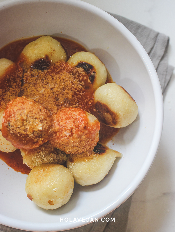 Hoy te comparto esta opción diferente. Hice la masa de ñoquis de papa de siempre, pero los rellené con mozzarella vegana y los grillé en una sartén bien caliente con aceite de oliva.