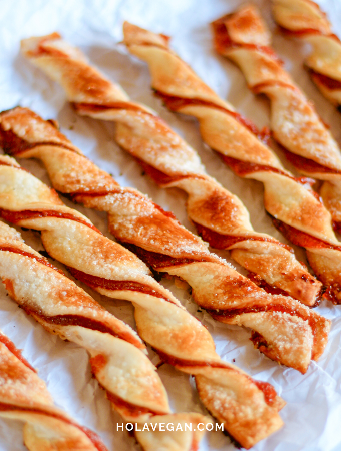La otra vez Lolét me había regalado 2 docenas de “las mejores” tapas de empanadas veganas del condado -que todavía no había probado- y me acordé de estos triangulitos materos que había compartido Sapa acá hace poco. Pero, golosa como soy, me dije a mí misma que había que ponerle algo más de onda. Por un lado, tenía un buen bloque del queso parmesano que enseñamos en nuestro CURSO DE LÁCTEOS VEGETALES 1, así que lo primero que se me ocurrió hacer fueron estos palitos de queso. Sin embargo, un estante más arriba de la heladera, me saludaba entusiasmado un buen bloque de dulce de membrillo. ¡Eureka! ¿Y si hago los palitos de masa pero en lugar de rellenos con queso, los relleno con membrillo?
