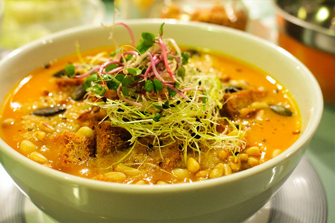 Que vivan los “Toppings”! En esta sopa puse crutones, brotes, semillas tostadas y levadura nutricional, un festival de sabores y texturas.