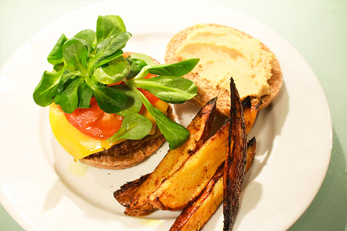 Serve the burger with hummus, dijon, vegan mayo, vegan cheddar, tomato and greens (or whatever you like) [br]Share and enjoy!