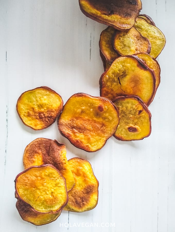 Lavar bien las batatas y las remolachas y cortarlas en rodajas finas. Si tuvieras mandolina podés usarla, para que te queden súper finas.